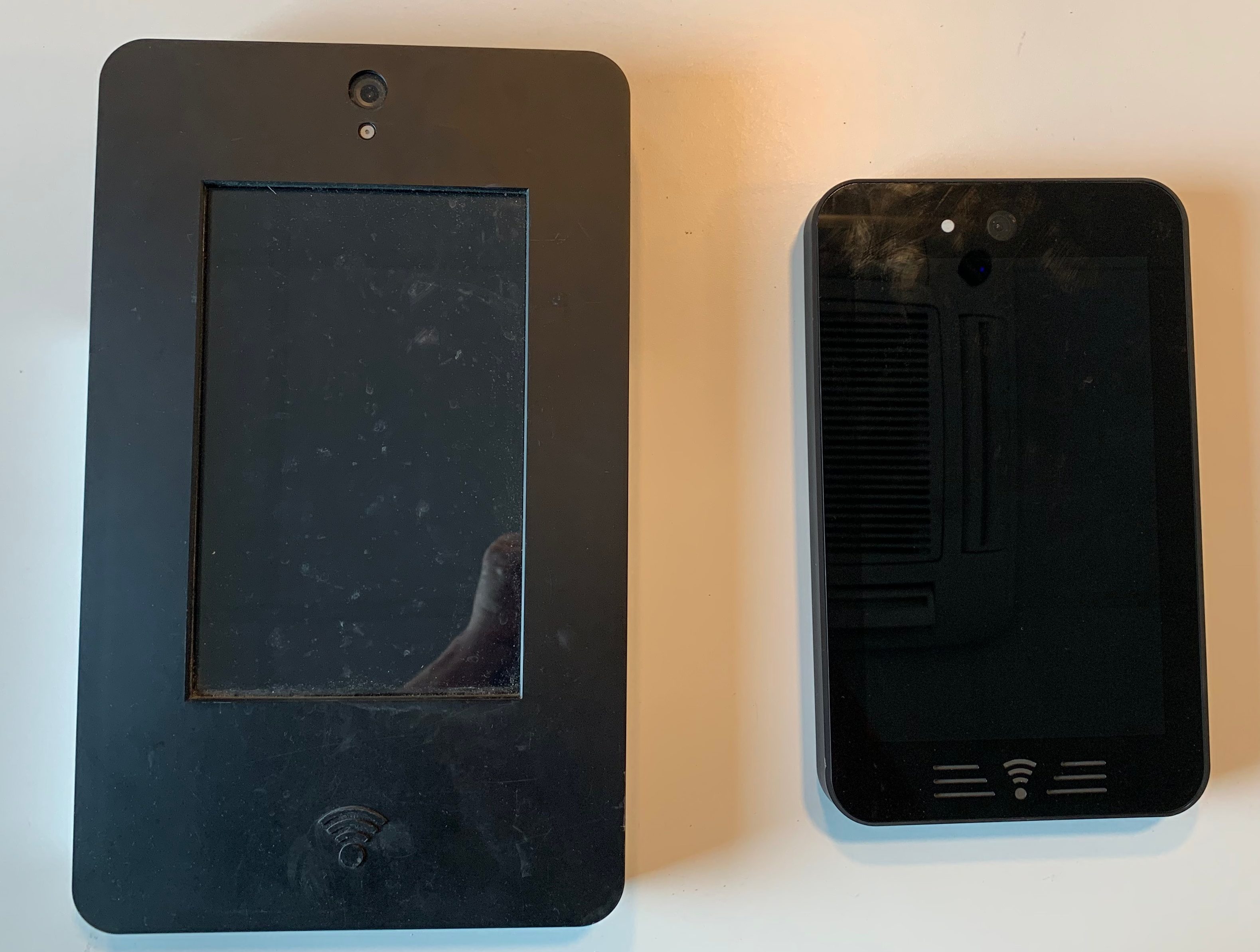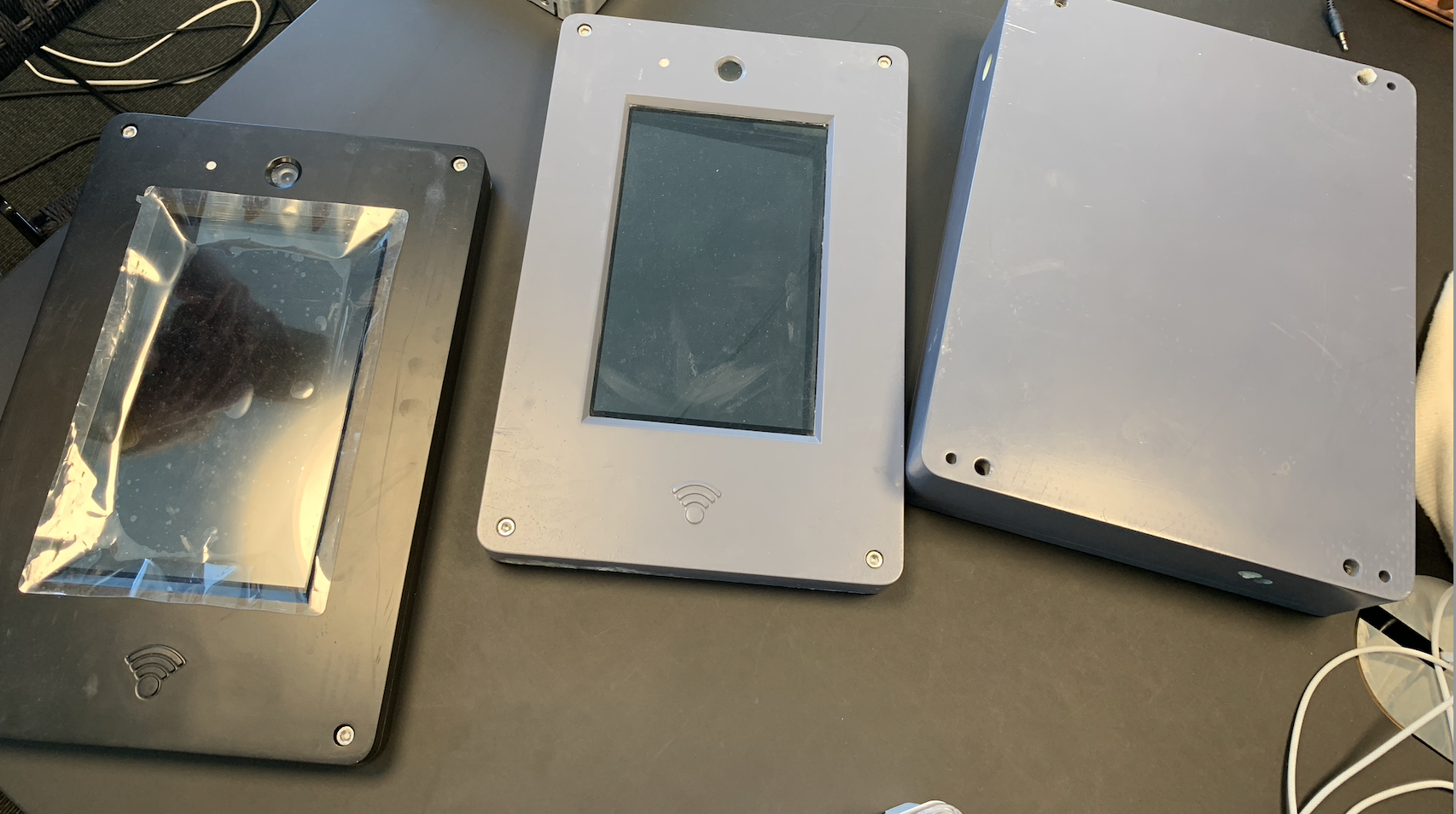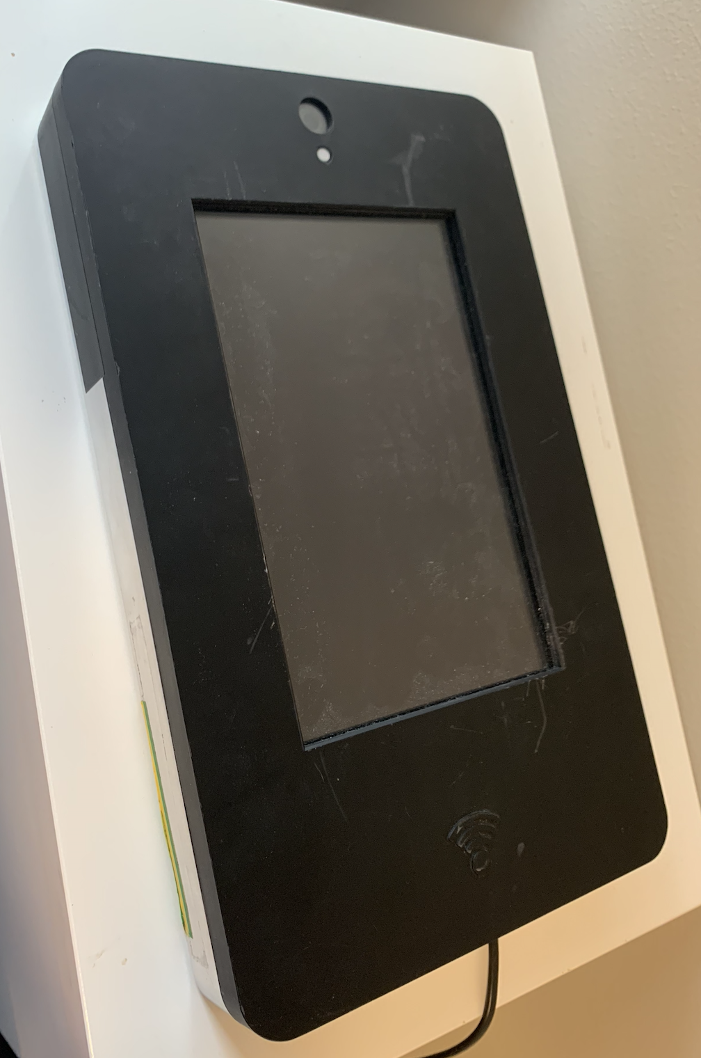 The previous generation of the Display Box that was mass produced. It featured a capacitive touch screen, RFID reader, a bulky chassis, only on-wall mounting option and multiple cables connecting to the Control Box. Due to the size and mounting method installation options were limited.
