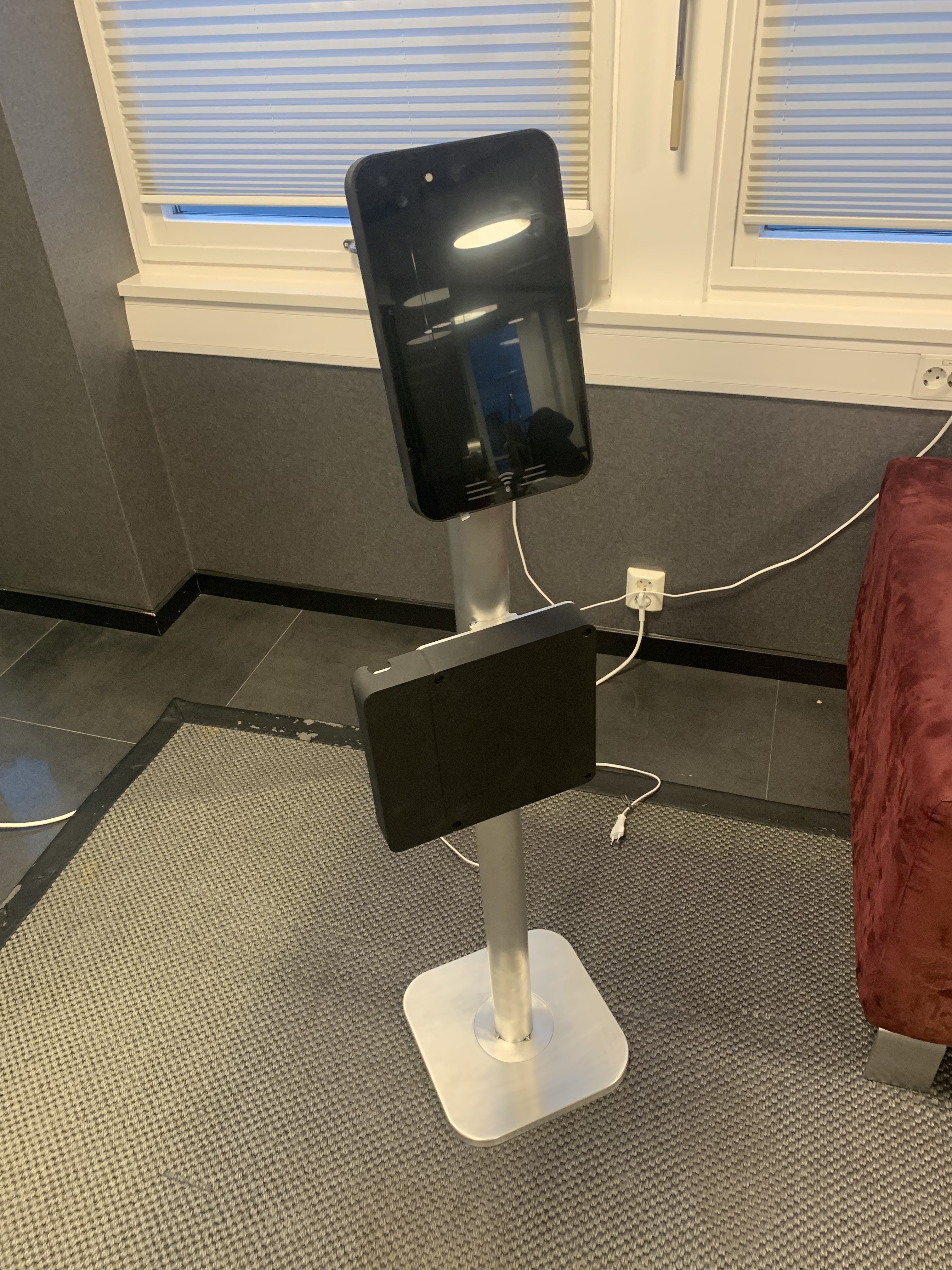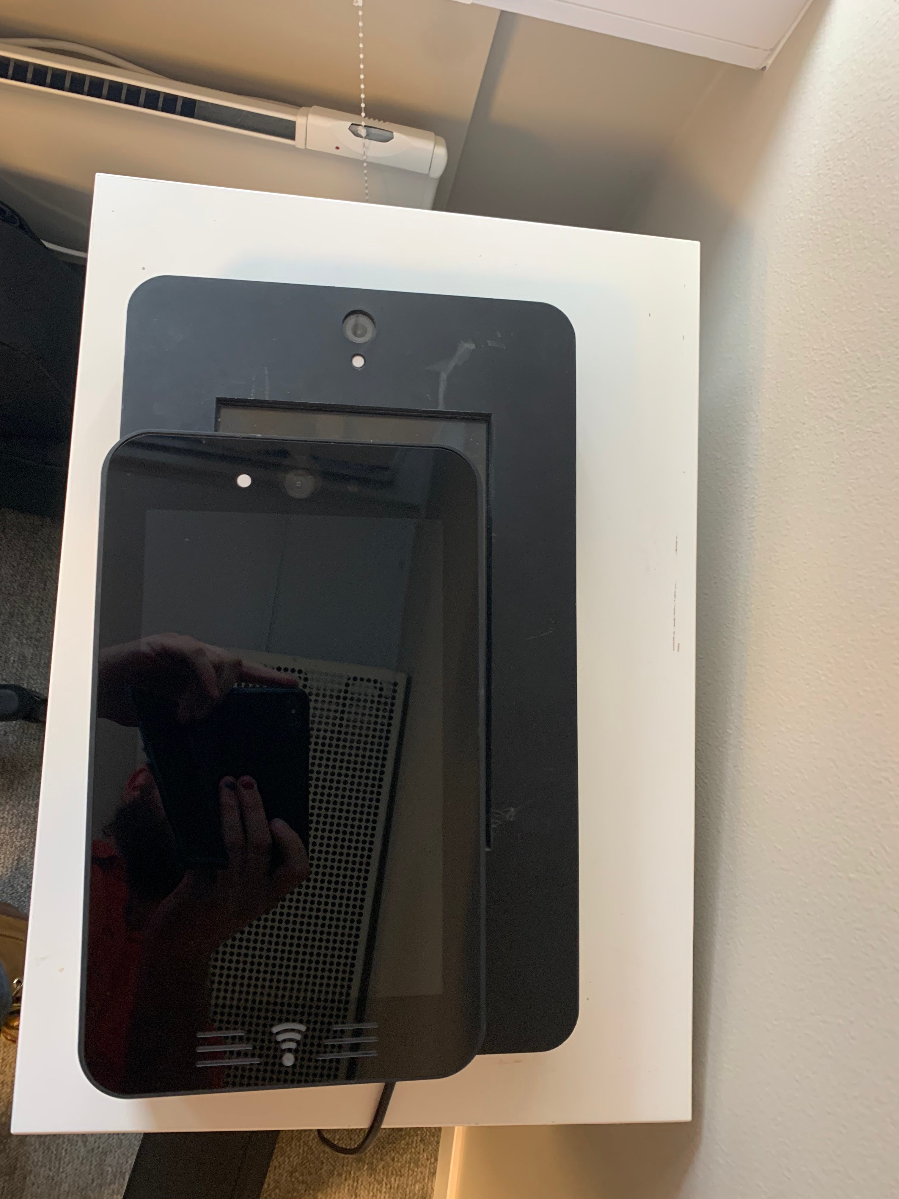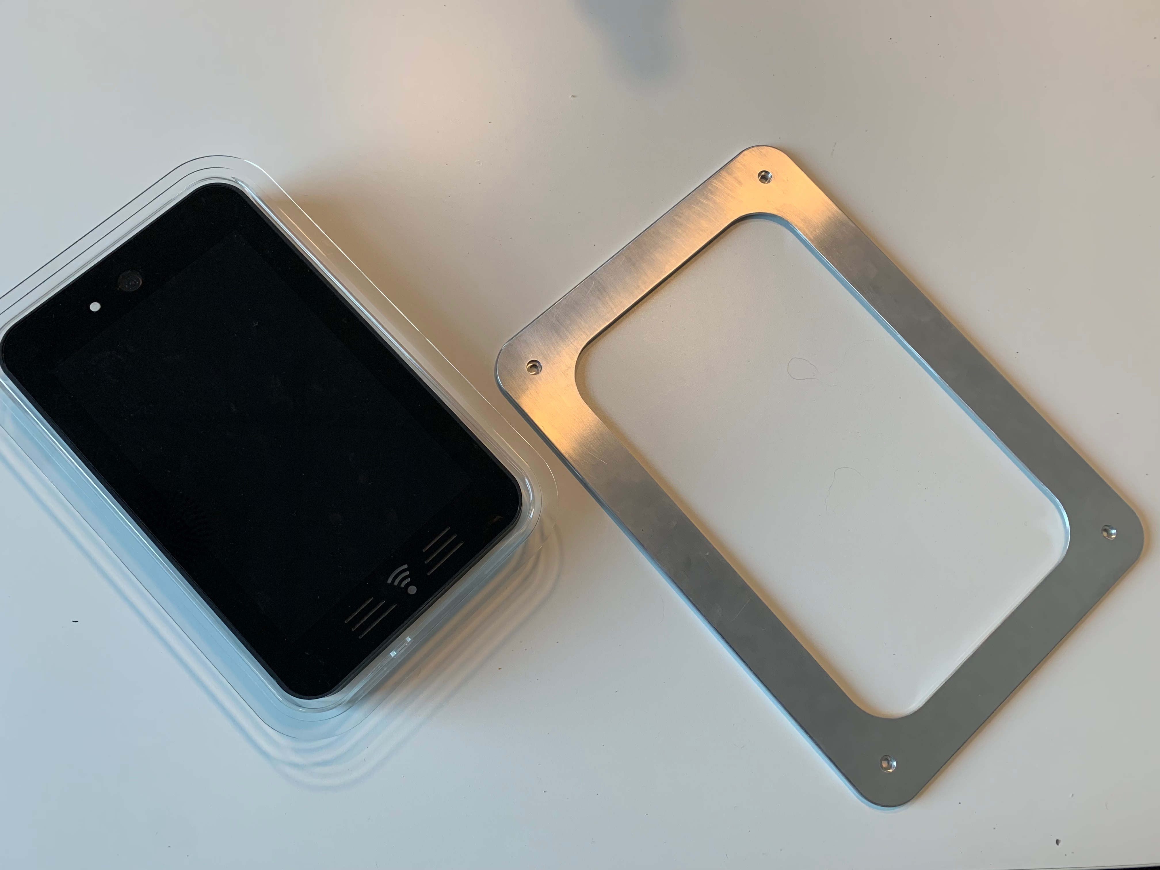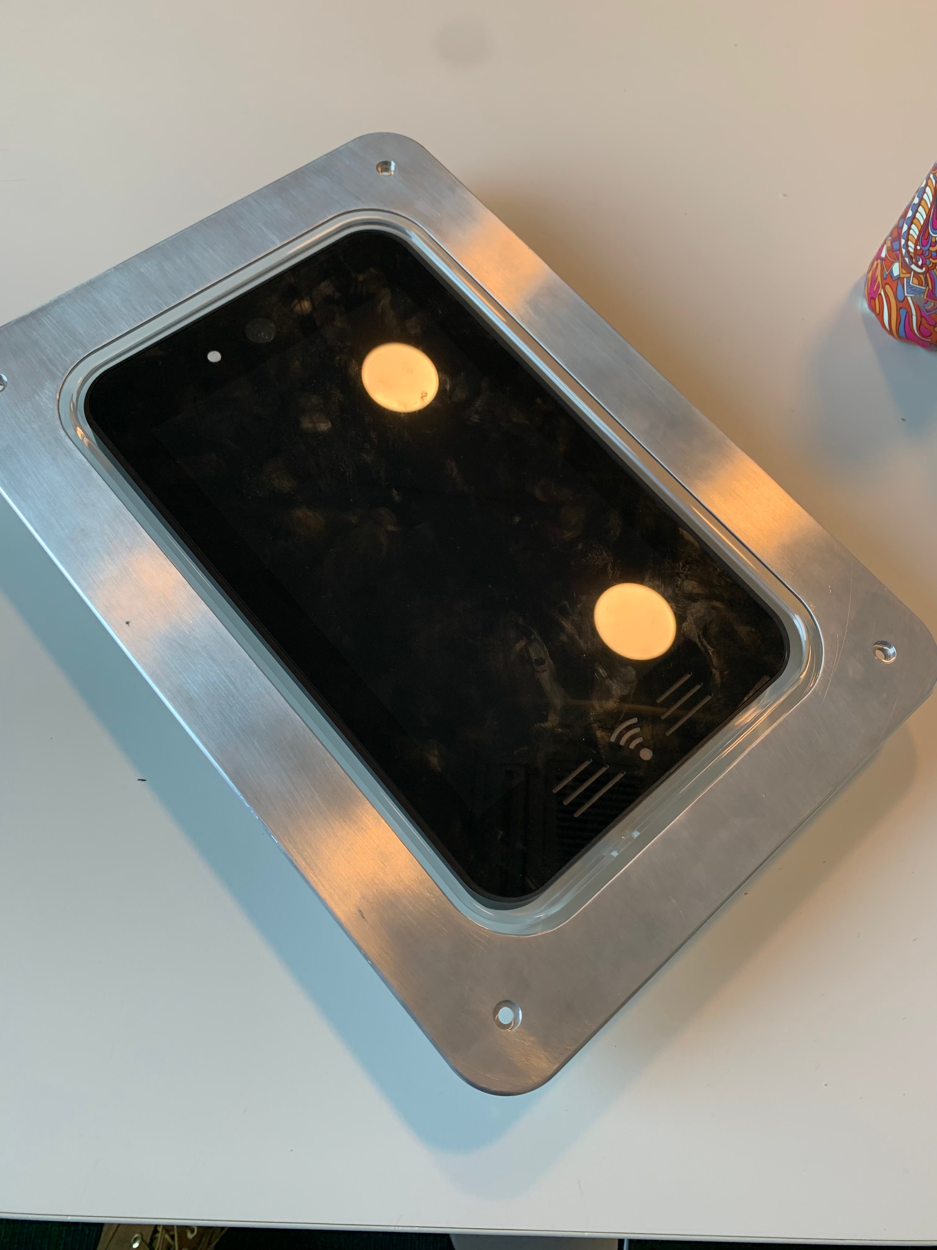 The previous generation of the Display Box that was mass produced. It featured a capacitive touch screen, RFID reader, a bulky chassis, only on-wall mounting option and multiple cables connecting to the Control Box. Due to the size and mounting method installation options were limited.