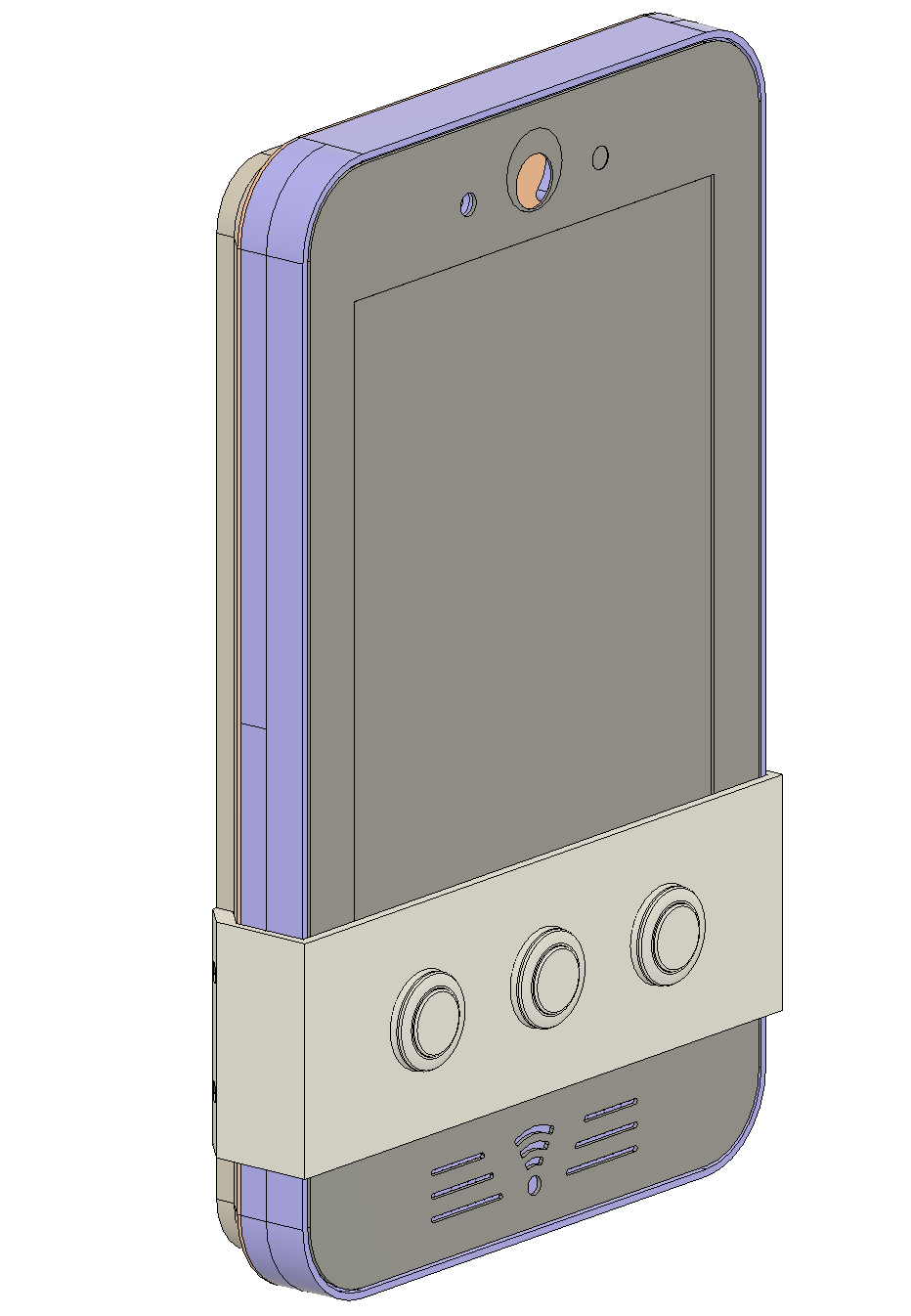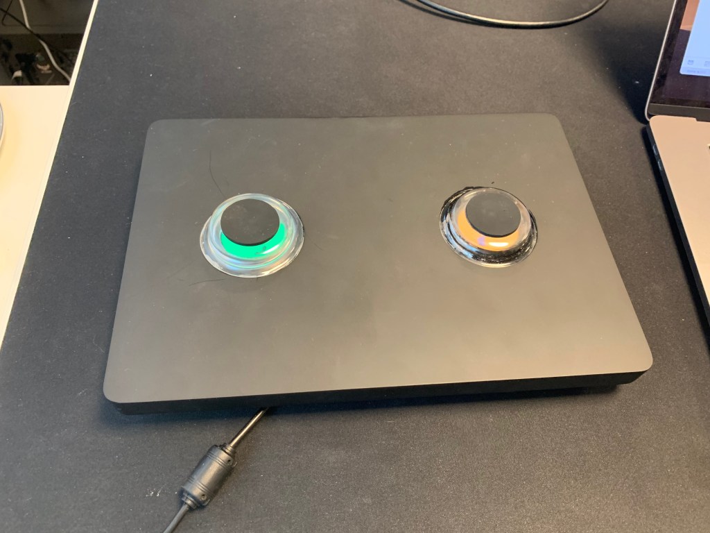 Projected to be a rugged stylish ball with haptic feedback, intergrated LED’s and speakers and microphones. Funtions included buttons for access control, a half split twist for volume and an included table stand.