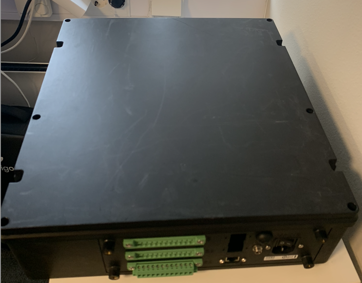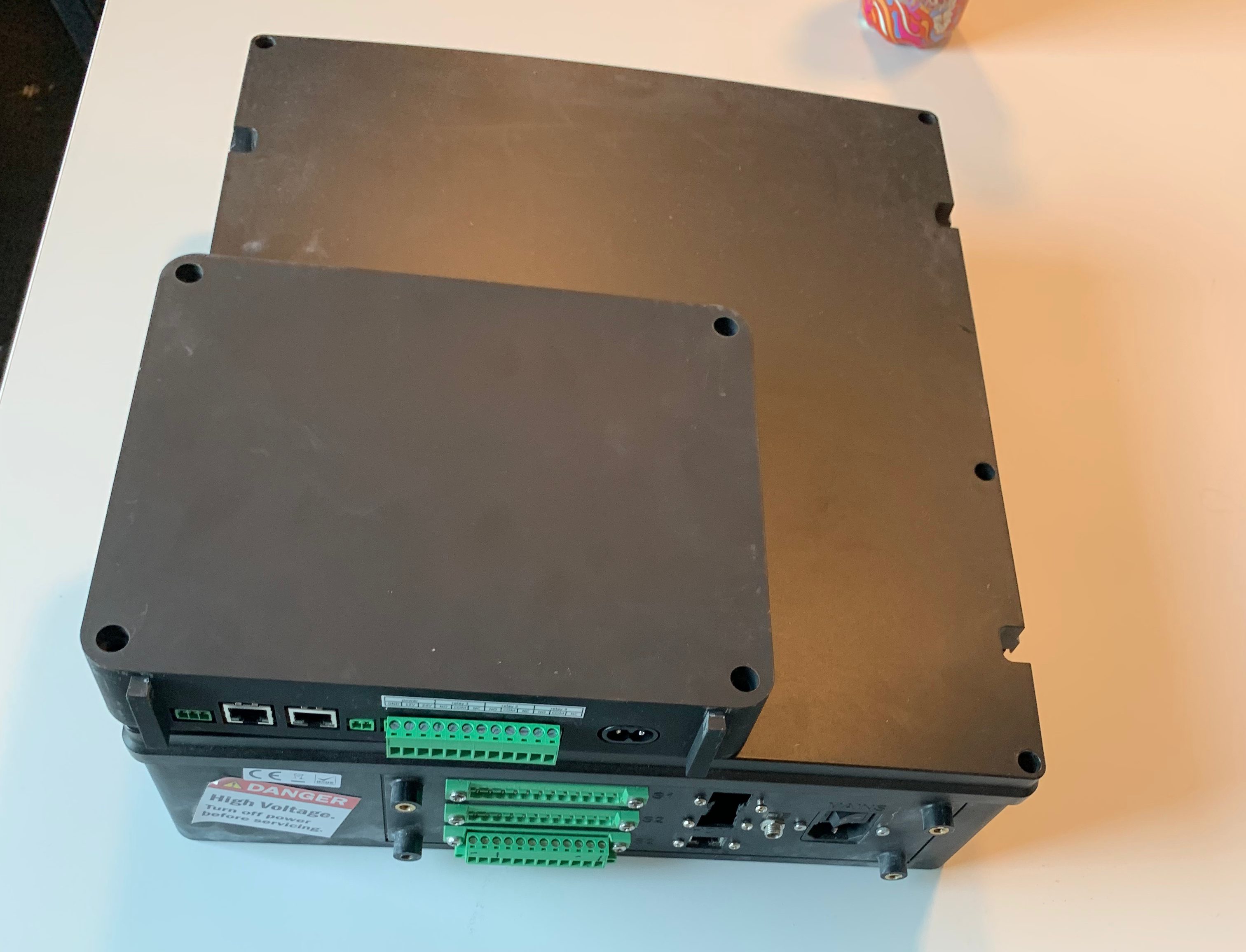 The previous generation of the Control Box on offer from Defigo. It features an oversized chassis footprint, multiple cables connecting to the Display Box, and a recesseed protective cover to secure connections and integrations.